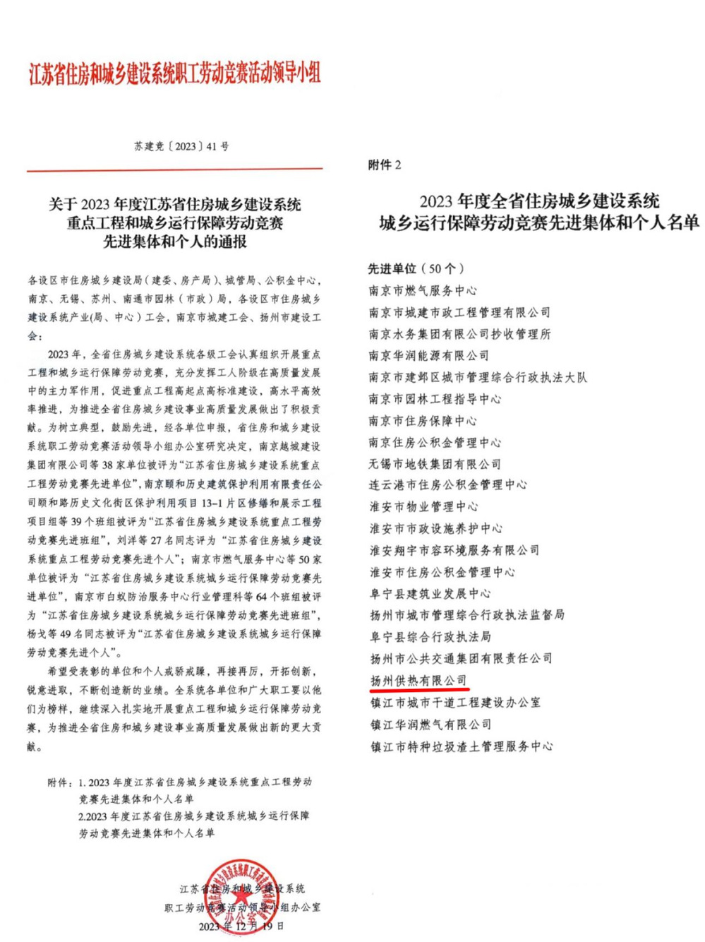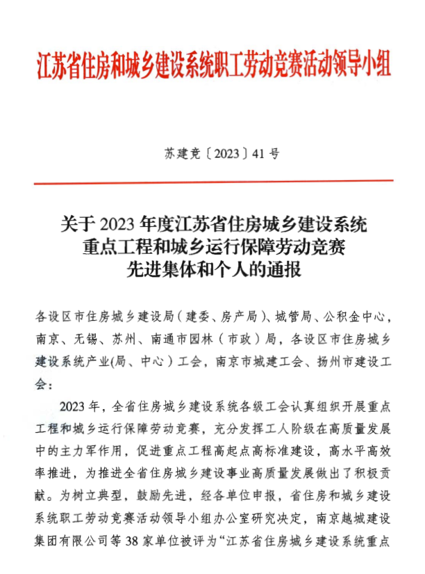 近日,江蘇省住房城鄉建設系統職工勞動競賽活動領導小組發布《關于2023年度江蘇省住房城鄉建設系統重點工程和城鄉運行保障勞動競賽先進集體和個人的通報》,供熱公司被授予“2023年度江蘇省住房城鄉建設系統城鄉運行保障勞動競賽先進單位”光榮稱號。