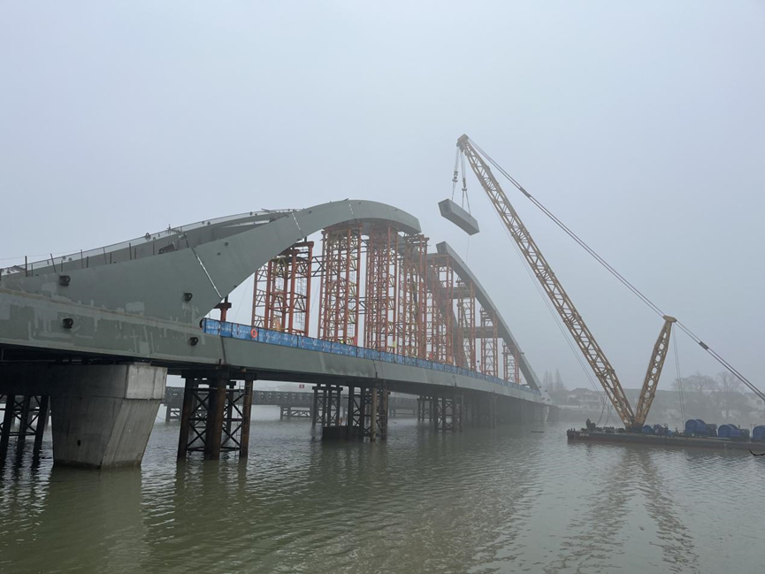 1月30日,隨著最后一段拱肋緩緩吊裝至合攏位置,歷時一年,壁虎河大橋鋼箱提籃拱橋主拱順利合攏,標志著該項目取得了重要節點突破。