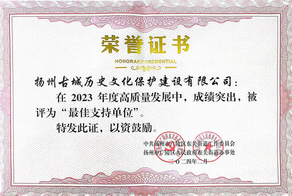 2月2日下午,廣陵區(qū)東關(guān)街道召開2023年度總結(jié)表彰暨2024年基層治理現(xiàn)代推進(jìn)大會,古城保護(hù)公司獲得“最佳支持單位”榮譽(yù)。