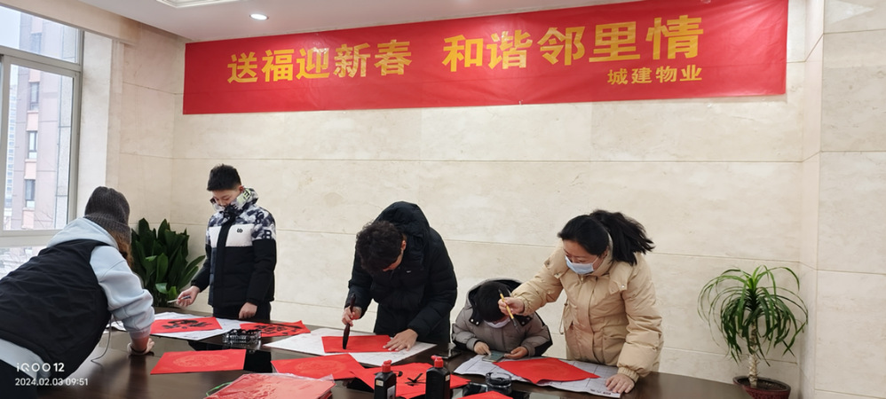 “福啟新歲,萬事順遂”。為慶祝新春,營造歡樂喜慶、祥和文明的節日氛圍,讓居民群眾深切感受到傳統“年味”,近日,城建物業公司分別在九境融園和京杭融園小區開展了“送福迎新春,和諧鄰里情”——寫春聯送福字活動。