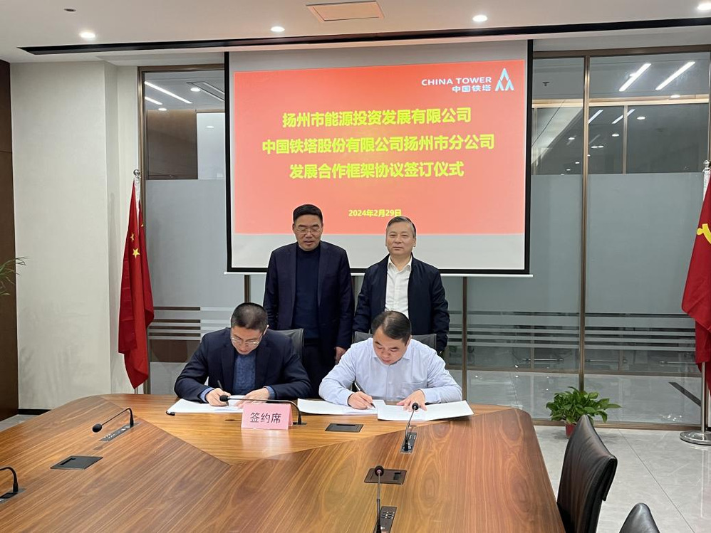 2月29日下午,揚(yáng)州能源集團(tuán)與中國鐵塔揚(yáng)州分公司簽訂發(fā)展合作框架協(xié)議,揚(yáng)州城控集團(tuán)副總經(jīng)理、揚(yáng)州能源集團(tuán)董事長孔德存與中國鐵塔揚(yáng)州分公司黨委書記、總經(jīng)理周太群出席簽約儀式。