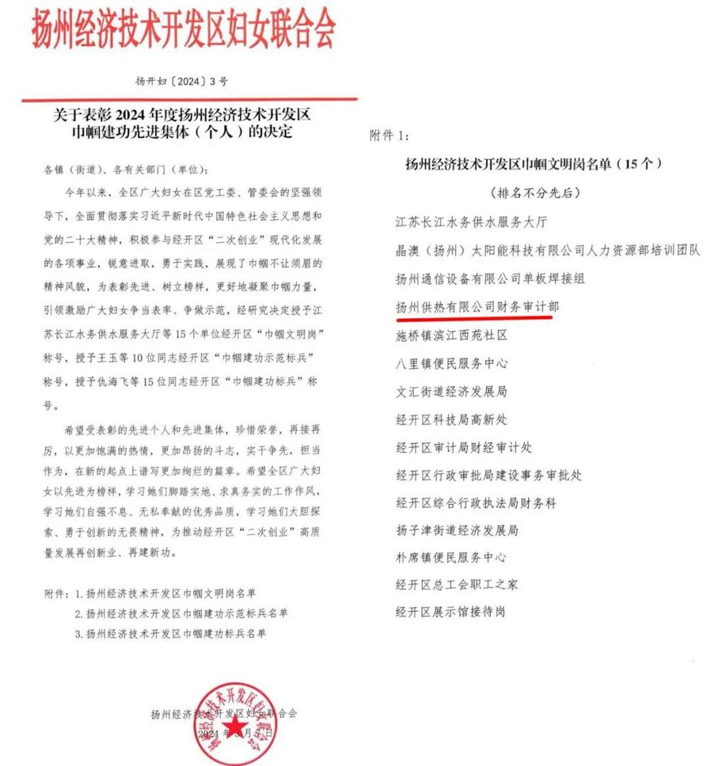 在第114個“三八”國際婦女節來臨之際,供熱公司多個女工集體和個人獲表彰,黨工部主管及紀檢監察員張娟榮獲“江蘇省住房城鄉建設系統五一巾幗標兵”稱號,財務審計部榮獲“揚州經濟技術開發區巾幗文明崗”稱號。
