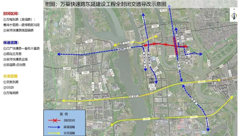 為保障萬福快速路東延建設工程的順利進行,自2024年5月8日起至2025年12月31日止,對萬福東路(春風十里路—頭道橋)、龍城路(頭道橋—進修路)、金灣快速路輔路(與龍城路交叉口南北各700米)進行全封閉施工。其中江廣快速路—春風十里路—高鐵東站全程保通,煙花三月路、金灣快速路主線、雙迎路交叉口南北向保通,同步保障世紀豪園、生態科技新城管委會、中石化油庫等小區及單位出行。廣大交通參與者可通過文昌路、G328等繞行。