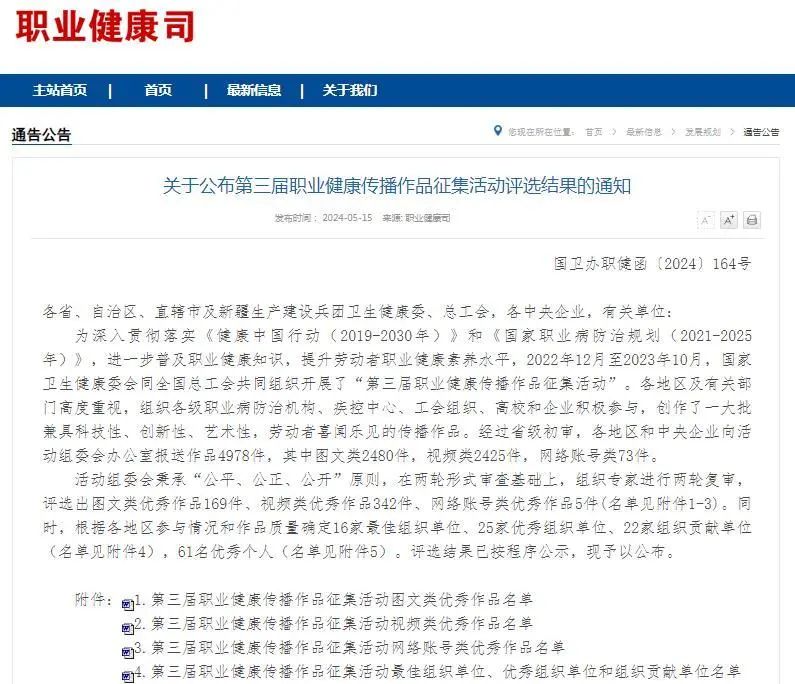 為深入貫徹落實(shí)《健康中國行動(2019-2030年)》和《國家職業(yè)病防治規(guī)劃(2021-2025年)》,進(jìn)一步普及職業(yè)健康知識,提升勞動者職業(yè)健康素養(yǎng)水平,國家衛(wèi)生健康委、全國總工會共同組織開展了“第三屆職業(yè)健康傳播作品征集活動”。我公司積極創(chuàng)作,踴躍參與征集活動,選送的《共享職業(yè)健康 共創(chuàng)健康水務(wù)》經(jīng)過初審、形式審查和專家評審等程序,入圍獲獎(jiǎng)名單。