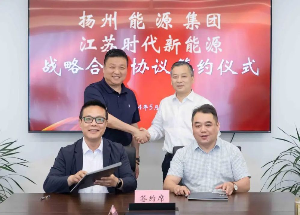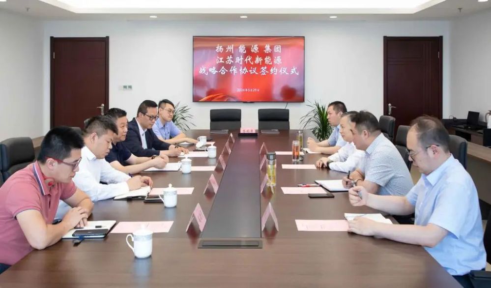 5月29日下午,揚州能源集團與江蘇時代新能源科技有限公司簽訂發展合作框架協議,城控集團副總經理、能源集團董事長孔德存與寧德時代區域總經理陳凌出席簽約儀式。