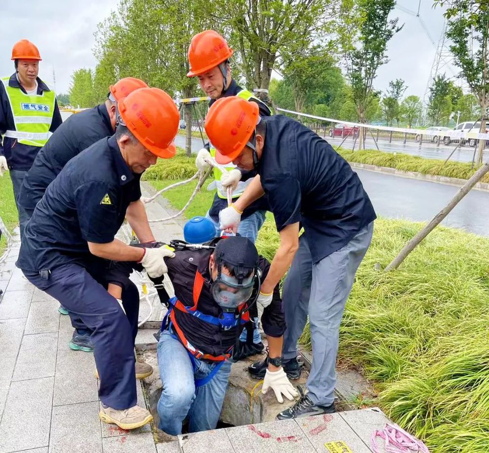演練模擬燃氣閥門井維護過程作業(yè)人員中毒窒息。在閥門井維護作業(yè)過程中,井下作業(yè)人員突感身體不適、呼吸不暢,不能自救,立即通知井外監(jiān)護人員施救。井外監(jiān)護人員立即報告現(xiàn)場搶維修組長,啟動應(yīng)急預(yù)案,開展應(yīng)急救援。設(shè)立警戒線,啟動排風(fēng)機強制驅(qū)散井內(nèi)有毒有害氣體,手持四合一便攜式檢漏儀不間斷監(jiān)測井內(nèi)有毒有害氣體濃度,穿戴正壓式呼吸器準備下井。待井內(nèi)有毒有害氣體濃度恢復(fù)正常時,救護人員穿著防護服下井施救,在井內(nèi)和井外人員全力配合下,成功救出受困人員。