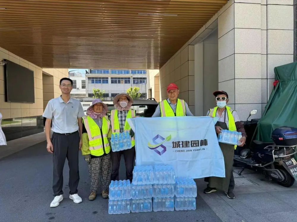 在京杭融園、九境融園、銀墅灣綠化養護項目、15米風光帶景觀綠化項目等多個施工現場,城建園林經理曾天斌帶領職工們共同為一線工人們送上數箱飲用水,叮囑大家注意防暑,保障自身的安全健康。“非常感謝公司的關心,我們一定會堅守崗位、努力工作,同時也會注意高溫避暑休息,錯峰養護”領到防暑降溫物資后,綠化養護工王師傅笑著說道。