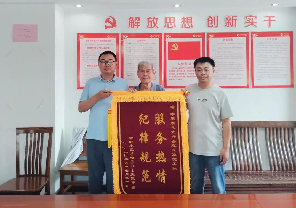 2024年7月26日,一個平凡的星期五,對于揚州中燃客服部來說,卻是一個充滿溫暖和感動的日子。來自錦旺社區(qū)居民代表王玉林老先生冒著酷暑送來了一面錦旗,上面繡著“服務(wù)熱情,紀(jì)律規(guī)范”幾個大字,這面錦旗是對揚州中燃燃氣立管改造工作的認(rèn)可。