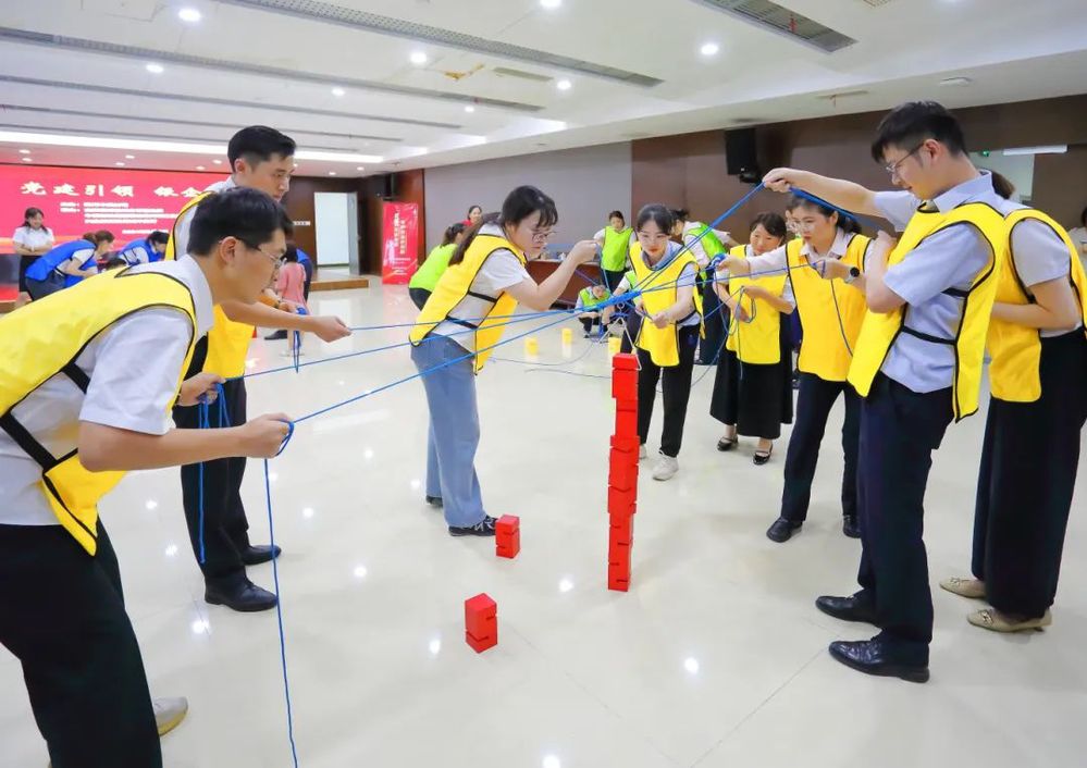 此次共建活動在歡快輕松的氛圍中進行,為充分調動大家的參與熱情,在主持人熱情地引導下,大家首先進行了熱身。熱身活動后,揚州中燃公司和三家銀行組建三支團隊依次開展“環游世界八十天”、“達芬奇密碼”、“聯合攻城”等一系列團隊協作競賽。大家在競賽互動中不斷磨合,增強了彼此之間的信任感和團隊凝聚力?!奥摵瞎コ恰弊鳛楦傎惌h節的最后一個項目,將現場的氣氛推到一個高潮。“聯合攻城”需要隊員們同時操控手中的繩子,利用三角形的鉤子,將現場的八塊積木堆積成一個柱子,堆積過程中手不可觸碰積木,且柱子不倒塌視為完成競賽,用時最少的隊伍獲勝。這項競賽既考驗了隊員們之間的團隊協作能力,又考驗了每一位隊員的心理素質和應對能力,大家在團結緊張活潑的氣氛中感受著充滿挑戰競賽過程和完成項目的喜悅。