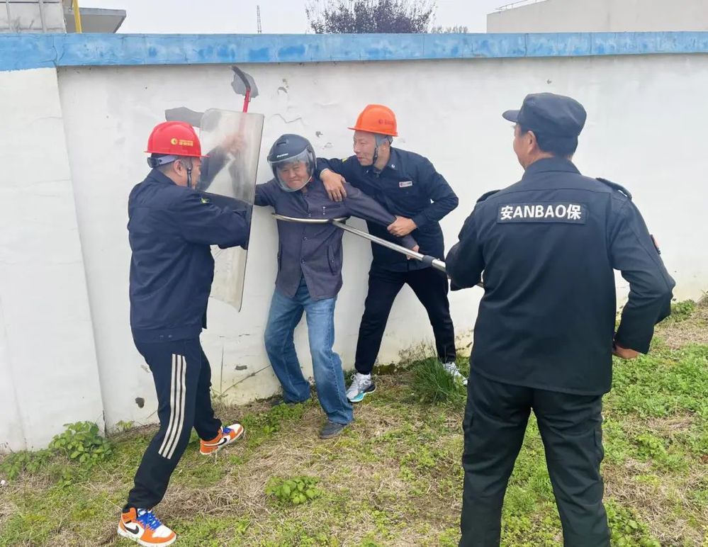 第二階段模擬恐怖分子持械進(jìn)入場站。門衛(wèi)在發(fā)現(xiàn)不明人員意圖進(jìn)入場站,按照反恐應(yīng)急處置流程,迅速電話報警,并組織人員,使用防暴器械,與門衛(wèi)人員一同制服該名恐怖分子,等待警方處置。