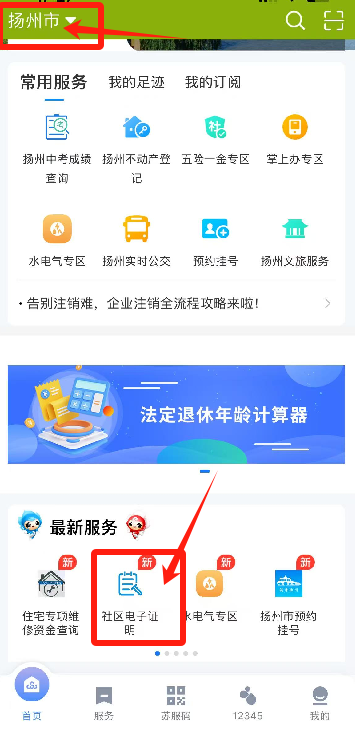 注冊登錄后,選擇揚州站點,在最新服務中,點擊“社區電子證明”。