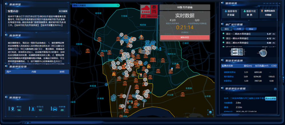 6月6日開始,各相關部門已根據天氣預警按照統一部署和既定安排開展污水設施加密巡查,部署好應急人員、物資隨時待命。6月7日凌晨3時23分氣象部門發布暴雨藍色預警后,公司立即通過“城排通”系統啟動應急預案,快速落實污水設施、雨水排口、易積水點和在建工程現場的巡查和應急處置工作。由于突降暴雨,市區部分道路很快出現積水,且涉及多個高考考點周邊,情況十分緊急,與此同時氣象部門緊急升級發布暴雨黃色預警。為及時做好處置,公司第一時間調整了應急響應等級,通過“城排通”系統實時監測運行數據,加強信息共享和部門間應急聯動,適時調整運行調控策略,對發現的路面積水險情,迅速指揮、調度搶險班組和物資開展應急排澇。