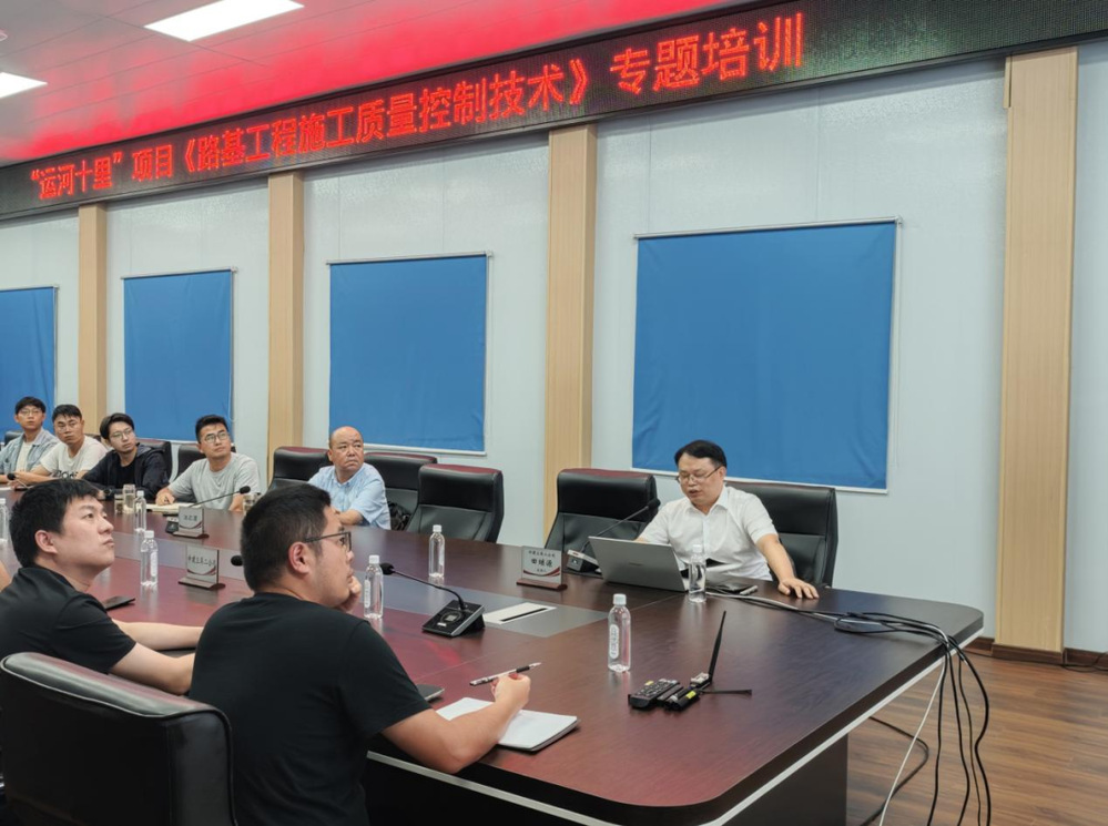 主講人以“路基工程施工質量控制技術”為題,引用路基工程施工真實案例,從施工準備、施工流程、施工要點,到常見施工問題及建議,細致而全面地講解了改良土路基施工和雙向攪拌樁路基施工的技術工藝及質量控制,培訓內容兼具技術性、針對性和可操作性,為“運河十里”項目后續(xù)建設工作打下堅實基礎。