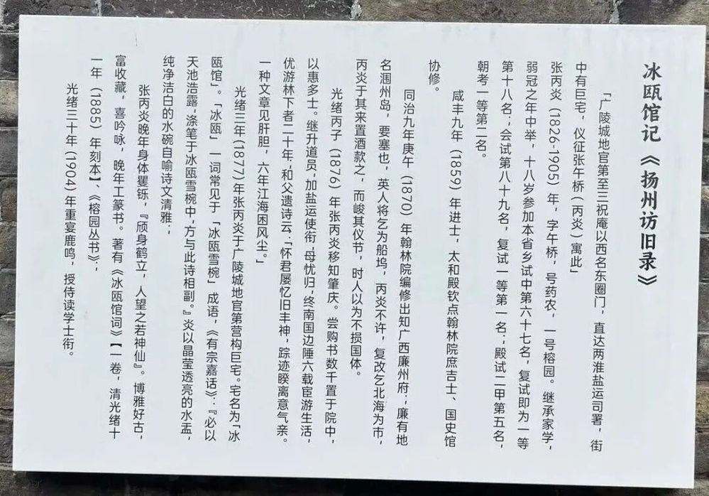 張丙炎的一生,橫跨晚清政治變革與文化轉型。他在嶺南的政績、對包世臣學術的承襲、對鄉邦文獻的守護,以及冰甌館的營建,共同構建起一個士大夫的文化樣本。其故居經修繕后獲評揚州市文物保護單位,更以“民宿+文化空間”模式,成為傳統建筑活化利用的典范。