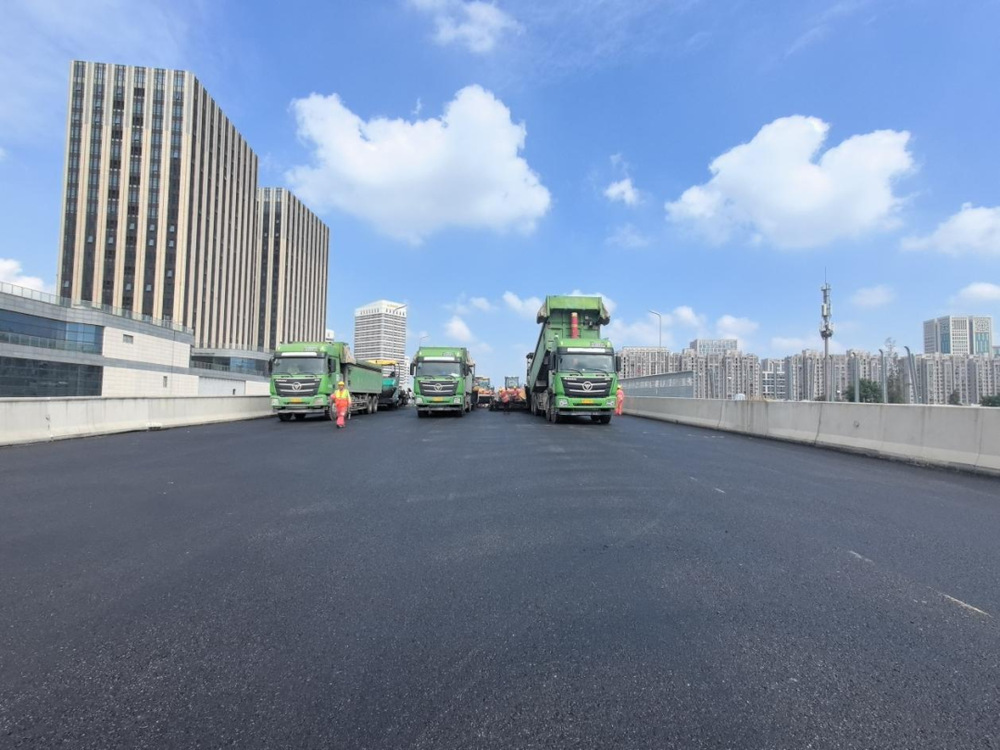 施工過程中,現場攤鋪機、壓路機等設備有序作業,管理人員對原材料質量、攤鋪溫度、厚度及平整度進行嚴格控制,確保各項施工符合各項規范要求,為后續橋面交通標志標線施劃、智能交通監控設施及亮化設備安裝打下基礎。