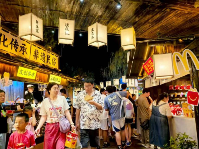 露天啤酒花園內(nèi),精釀啤酒與揚(yáng)州老鵝、臭干等本地小吃組成奇妙CP,引得游客紛紛駐足。當(dāng)夜幕降臨,千米長(zhǎng)的東關(guān)街燈火通明,“千里照壁燈”景觀與啤酒節(jié)的璀璨燈光交相輝映,真正實(shí)現(xiàn)“晝夜皆景、越夜越美”的消費(fèi)新格局。